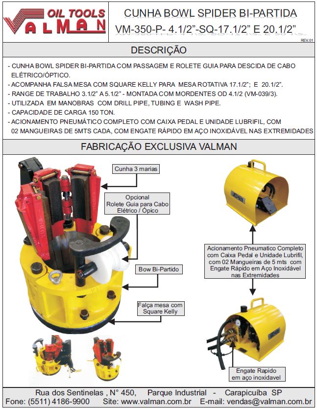 Cunha hidráulica Bowl Spider VM-350-H , com passagem e rolete guia para cabo elétrico , optico .